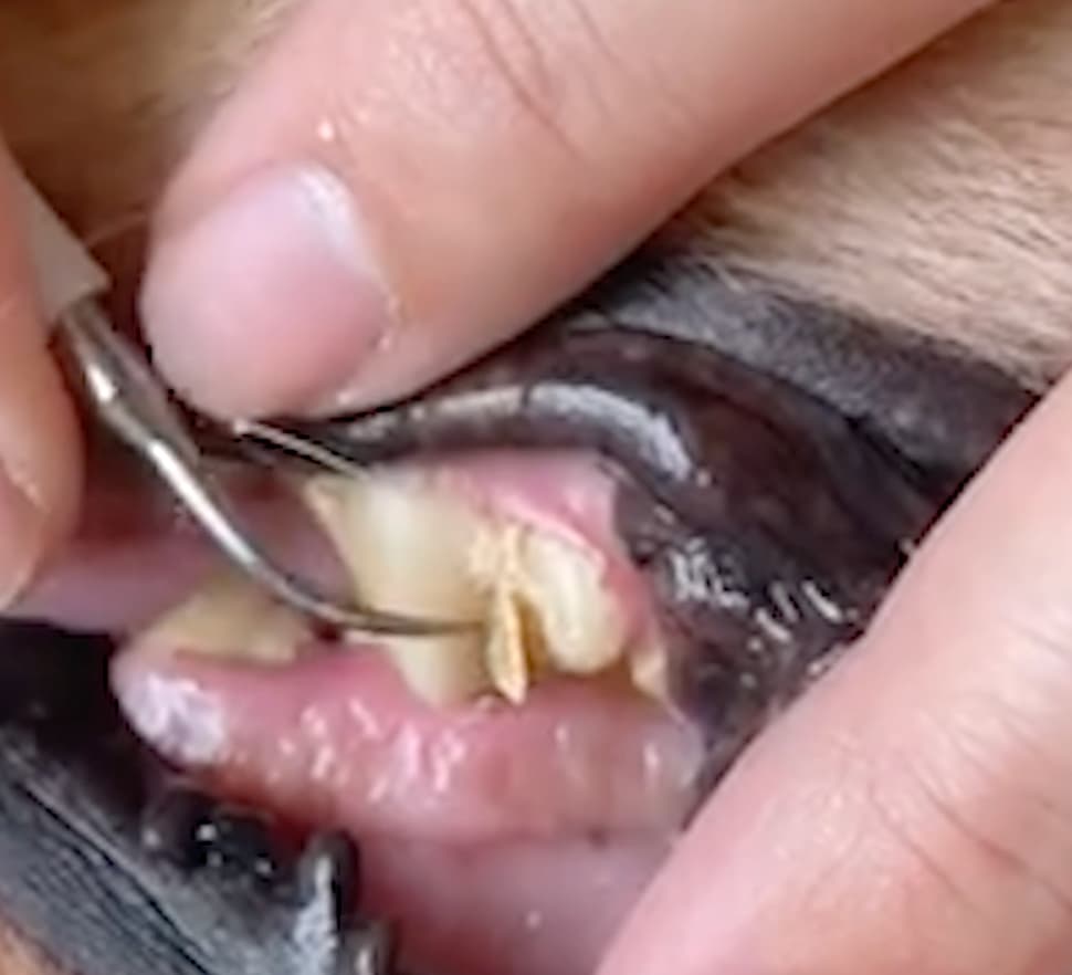 Une fois le tartre éliminé, les dents sont propres et blanches. Récompensez votre chien avec une friandise !